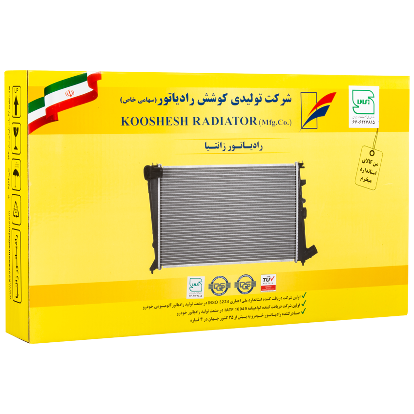 این رادیاتور جهت نصب بر روی خودروهای زانتیا تولید شده، همچنین این محصول دارای شیر تخلیه بوده و اتصالات رادیاتور به موتور با شیلنگ و بست پیچی انجام میپذیرد. جهت استفاده بهینه با طول عمر بیشتر این رادیاتور در تمامی فصول از محلول ترکیبی آب، ضد جوش و ضدیخ استاندارد استفاده نمایید. رادیاتور خودرو زانتیا، تولید شده از مرغوبترین مواد اولیه و بهینه شده جهت عملکرد خنککنندگی بهتر موتور خودرو میباشد. محصولات شرکت تولیدی کوشش رادیاتور دارای کارت گارانتی یک ساله میباشند. شرکت تولیدی کوشش رادیاتور دارای استاندارد ملی اجباری و تاییدیه صنعت سبز ملی در صنعت تولید رادیاتور خودرو میباشد.